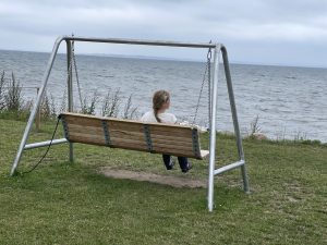 Der Platz liegt an der Ostküste der Insel mitten in Dänemarks größtem Küstenwald bei dem kleinen Fähr-Ort Fynhavn. Wir haben tiefrückseitig strammen Ostwind und die Wellen tosen an das Ufer. Der Platz mit Blick auf die Fähre, den wir gerne haben wollten, liegt oben auf dem Hügel mitten im Wind. Wir entscheiden uns daher um für einen Platz im Windschatten am Spielplatz mit etwas Meerblick (Nr. 30).