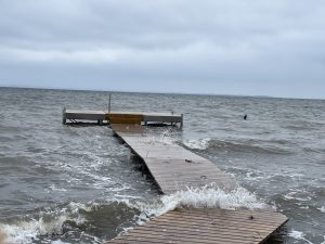 Es bleibt lange trocken und Merle badet sogar im Meer – gefühlte Lufttemperatur im Ostwind bei 17 Grad. Es gibt einen kleinen Steg mit Badeplattform, an dessen Ende sie in die Fluten taucht und mit den Wellen spielt. Floki fehlt natürlich auch nicht im Wasser und bald sind wir alles mehr oder weniger nass.