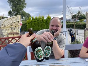 Nach der anschließenden Dusche gehen wir zu Abend aus – auf dem Campingplatz gibt es Flammkuchen und ein Bierchen für uns und eine Focaccia für Merle.