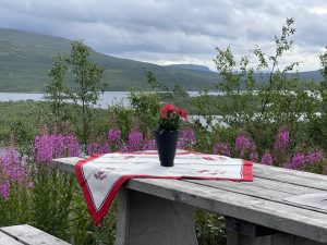 Daher fahren wir weiter und passieren die Grenze nach Norwegen. Kurz hinter der Grenze gibt es einen tollen namenlosen Rastplatz mit Ausblick auf den Gaalggojärvi, wo wir dann schlussendlich nach einer Stunde Gesamtfahrt- und quengelzeit frühstücken. Merle passte das nämlich gar nicht, den Tag nicht wie gewohnt mit einem Frühstück am Platze zu starten.