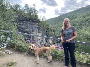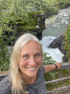 Wir deckten den Picknicktisch und genossen unser Frühstück in Norwegen. Anschließend fuhren wir weiter bis zum Wasserfall namens Rovijoen Putous. Hier kraxelten wir ein wenig und genossen, dass die Sonne herauskam – obwohl heute den ganzen Tag Regen vorhergesagt war.