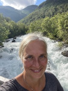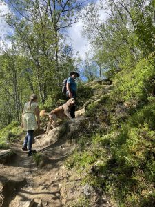 Wir parken im Steindal und folgen dem Pfad hinauf. Wir wollen zur Steindalshytta. Der Weg ist mal „grün“, also leicht, mal „blau“, also mittel gekennzeichnet. Die 2,5 Kilometer werden wohl machbar sein, denken wir. Der Weg geht den Gletscherbach entlang und ist wunderschön. Mücken gibt es hier Gott sei Dank nur die wenigen üblichen, dafür hat er hier riesige Bremsen. Merle knötert den ganzen Weg hinauf und hinunter herum. Irgendwas findet sich ja immer, über das man meckern kann. Abe schlussendlich nimmt sie es mit Humor.