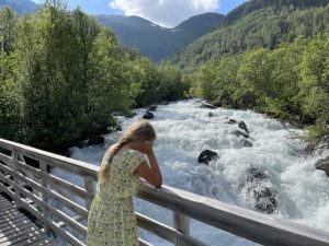 Schlussendlich siegte die Sonne. Steindal 1 – Familie Peters 0. Müssen wir nochmal wiederkommen. Auf dem Rückweg machen wir noch einen Abstecher zur Nedren Brua und genießen die kühle Luft über dem Gletscherbach. Am Parkplatz angekommen treffen wir Koreaner, die mit ihrem koreanischen Reisemobil bis hierher nach Norwegen gefahren sind und sind schwer beeindruckt.