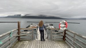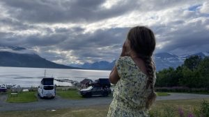 Anschließend fahren wir weiter auf die Westseite der Lyngenalpen bis nach Svensby. Der Fjord hier ist unfassbar türkis. Wunderschön. In Svensby angekommen, mieten wir uns auf dem Campingplatz ein, da wir dringend eine Dusche brauchen. Der Platz ist komplett selbstbedienend, bezahlt wird per QR-Code. Die Duschen sind dafür mit inbegriffen. Wir wollen auch noch unsere Stinkewäsche waschen, was allerdings 120 Kronen kostet – so teuer haben wir noch nie gewaschen.