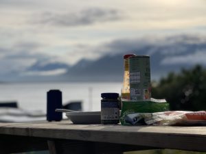 Während Christian mit Merle duschen waren, habe ich schonmal Nudeln gekocht. Am Abend konnten wir dann mit atemberaubender Sicht auf die Halbinsel östlich von Tromsö (die leider keinen Namen hat), dem Wolkenspiel und den Sonnenstrahlen draußen am gedeckten Tisch zu Abend essen. Ein schöner Tag geht zu Ende.