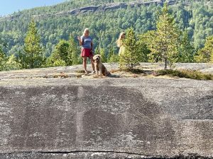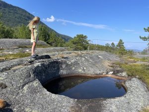 Südlich von Bognes führt die E6 eher durch – im Vergleich – langweiligere Landschaften. Bewaldete Berge, tiefe Seen und viele Moore. Wir machen eine kurze Spazierpause bei den Felsritzungen in Steigen. Die Helleristninger hier haben wir schon viele Male gesehen und sie sind immer wieder schön. Dann fahren wir aber noch weiter, denn die Picknicktische hier sind alle belegt und ohne diese hat der Platz keinen Charme.