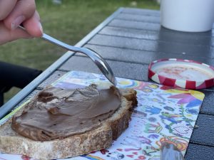 Als ich dann später vorrechnete, wie lange unsere Fahrzeit heute sein würde, kam: „warum sind wir so spät dran? Iss schneller! Lass uns losfahren.“ Als ich dann sagte, dass wir Urlaub haben, war das natürlich etwas ganz anderes. Und was passiert, wenn man es einig hat? Die anderen haben Spaß am Experimentieren, zum Beispiel Schokocreme mit Joghurt.