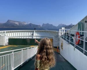 Dank unserer perfekten Zeitplanung und trotz der Trödler vor uns kommen wir 5 Minuten vor Abfahrt der Glutra von Skarberget nach Bognes am Fährhafen an. Die Fährfahrt führt noch ein letztes Mal durch diese Gegend und wir saugen sie bei dem schönen Wetter – 28 Grad und Sonnenschein – in uns ein. Im Hintergrund haben wir noch den Blick auf die Vesteralen und die Lofoten im Westen, unter uns das türkisfarbene Meer, umgeben von Mondbergen. Was kann es schöneres geben?