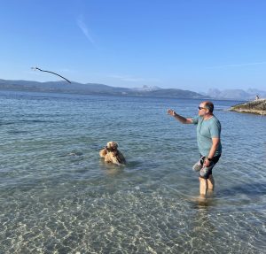 Floki und ich stürzen und zwei Mal ins Wasser. Und das war wirklich kalt. Maximal 14 – 16 Grad schätze ich hat der Saltstraumen in der Flut. Der Campingplatz hat einen kleinen Sandstrand in einer geschützten Bucht, in der wir abgetaucht sind. Zum aufwärmen haben wir uns dann auf die schwarzen Steine gelegt und in der Sonne gebadet. Ganz ehrlich, wir waren schon drei Mal auf diesem Campingplatz, aber immer bei miesem Wetter und wussten bislang nicht einmal, dass es hier einen tollen Sandstrand gibt.