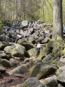 Irgendwann kamen wir dann endlich im Odenwald an. Merle überraschten wir mit dem Felsenmeer hier. Sie freute sich riesig und wir splitteten uns bei strahlendem Sonnenschein in zwei Gruppen auf: Christian und Floki gingen den Wanderweg hinauf, während Merle und ich das Felsenmeer erkletterten.