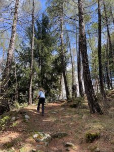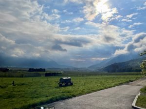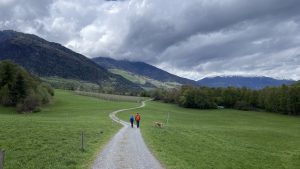 Unser Tag im Vinschgau startet mit einem Sonnen-/Wolken-Mix. Als Christian mit dem Hund Gassi auf einem Teil des Wanderwegs Nr. 7 direkt am Platze gehen wollte, wusste er nicht recht, was er anziehen sollte. Hier in den Bergen Südtirols ist es ähnlich wie in Norwegen: In der Sonne sehr warm, im Schatten frostige 8-11 Grad. Da nimmt man besser dicke Mütze sowie dünne Kleidung mit, auch für kürzere Strecken.