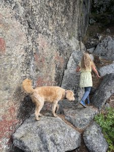 Christian hat ein wenig Sorge um unser Fahrzeug und ist not amused. Am Ende gibt es einen großzügigen Parkplatz mitten im Nichts. Von hier führen zwei kurze Wanderwege, jeweils etwa 500 – 800 Meter lang bis an das Ufer zu den Felsmalereien, prähistorische Rentierfallen sowie einer Höhle und einer, etwa 200 Meter lang zu einer Aussichtskuppe. Hört sich nicht lang an, ist aber an Bedingungen geknüpft. Denn es hat hier mehr Mücken als Blaubeeren und man darf alles, aber auf gar keinen Fall im Unterholz stehen bleiben.