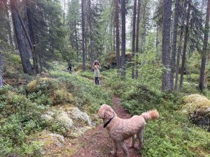 Heute Nacht hat es hier am Russfjärden in Strömsund geregnet. Als ich am Morgen mit Floki durch die Blaubeeren stapfe, nieselt es noch immer. Die Staumauer mit der Fischtreppe sieht ein wenig aus wie am Halterner Stausee. Seit langem machen wir heute wieder einmal das Hundehandtuch schmutzig.
