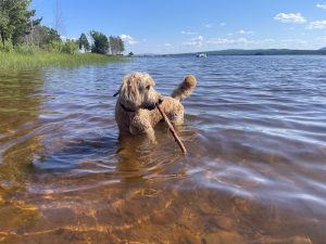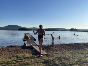 Unser Platz hat eine schicke Holzterrasse. Finden wir. Findet Merle nicht, die sofort einen Splitter in den Fuß bekommen hat. Wir haben einen kurzen Weg zum Wasser und gehen erstmal eine Runde schwimmen. Der See ist flach, aber nicht so flach wie der letzte. Am Steg ist das Wasser etwa 1,80 m tief. Und 24 Grad warm! Also Abkühlung bietet nur der immer noch wehende Nordwind. Mit Floki besuchen wir die Hundestrände. Sie sind etwas direkter am Platze und daher können wir den Hund nicht losmachen, sondern nur an der langen Leine ins Wasser scheuchen.
