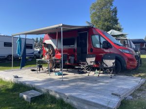 Der Campingplatz ist zwar groß (etwa 150 Plätze), aber sehr persönlich geführt. Der Campingväkt Lars fährt mit seinem kleinen Elektroauto voran und weist uns in den Platz ein. Er holt auch noch zwei Schrauben und einen Akkuschrauber, um unsere Markise an der Veranda zu befestigen. Es ist vom Gefühl her anders, als auch dem letzten Platz. Die Menschen hier laufen nicht quer über die Parzellen, man unterhält sich unaufgeregt. Sehr nett und ruhig. Und es hat wesentlich mehr fliegendes Viehzeug hier.