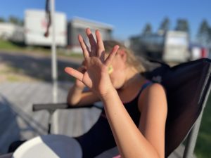 Anschließend grillen wir Burger und nutzen die tollen, kostenfreien Duschen und sitzen draußen und schauen auf den Sonnenuntergang auf dem See. Natürlich mit Anti-Viehzeig-Thermacell.