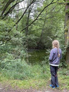 Unser Übernachtungsplatz ist heute der Wanderparkplatz „Oberalsterniederung“ in Henstedt Ulzburg, direkt am Rande des Naturschutzgebietes. Als wir von der Autobahn herunterfahren, ist es schon dunkel. Gefühlt über einspurige holperige Waldwege gelangen wir zu unserem Ziel. Der Parkplatz ist sehr klein, aber leer. Ich weiß noch, wie daheim folgendes Gespräch verlaufen ist: „Brauchen wir die gute Taschenlampe?“ – „Nein, die haben wir noch nie gebraucht“. Aber auch mit unserer kleinen Funzel gelang das Einparken schlussendlich ganz episch unter dem am Horizont aufsteigenden Vollmond.