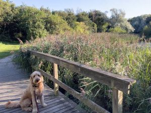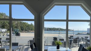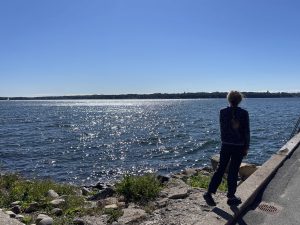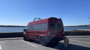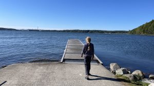 Die Gegend hier ist sehr mondän und Floki darf auch nicht auf der Vereinswiese spielen. Macht nichts. Wir haben einen tollen Blick auf Förde, Segelboote, Kanuten und Touristen im Sonnenschein während wir frühstücken.