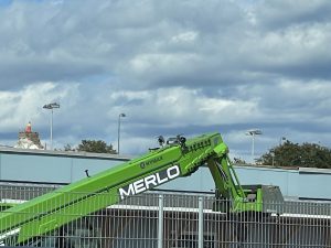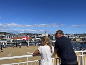 Dann geht es weiter zum Fähranleger in Kristiansand. Wir fahren mit Fjordline um 14:20 und das Schiff heißt Bergensfjord. Die Baggerarbeiten zur Erweiterung der Fähranlage ist noch immer im Gange. Merle sieht sofort den einen Bagger, der Merlo heißt.