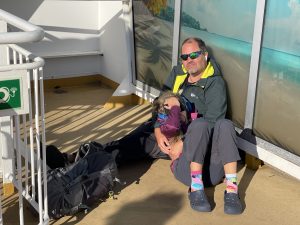 Auf dem Achterdeck ist es richtig windig. Der gute Nordostwind bleibt uns erhalten. Wir setzen uns in die Loungemöbel. Leider waren nur Schattenplätze frei, denn wir waren fast die letzten, die an Bord durften.