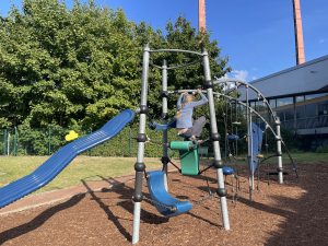 Wir genossen noch einen Tee an der einzigen Bank, die schon in der Sonne stand und Merle besuchte kurz den Spielplatz. Ein Däne fegte den Rastplatz, pickte Müll auf und flämmte Unkraut ab. Ich verdankte mich bei ihm für den tollen Job, denn im Gegensatz zu den üblichen Müllbergen an deutschen Raststätten ist es hier schon fast gemütlich sauber. Skandinavisch halt. Er freute sich sehr und sagte, dass das notwendig sei, da viele Menschen den Platz hier besuchen. Das sehen wir genauso. Warum klappt das bei uns nicht? Vielleicht kommt das ja noch irgendwann.