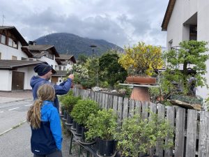 Auf dem Weg dorthin über den „Sandweg“ kommen wir an einem Haus vorbei, an dem mehrere Dutzend uralter wunderschöner Bonsaipflanzen stehen. Die Pflanzen sind Miniaturen von heimischen Arten wie Forsythie, Pinie oder Birke. Unfassbar, wie so etwas gelingen kann. Merle kannte bislang das Bonsai-Konzeot noch gar nicht und war ebenfalls fasziniert.