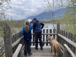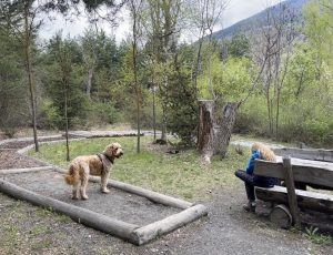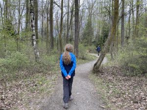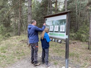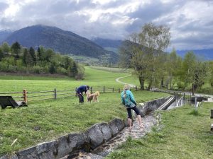 Es gibt beispielsweise einen Barfußpfad, den Merle auf Socken gelaufen ist und verschiedene Waale, künstliche Bewässerungsrinnen als alter Zeit. Merles Lieblingsplatz war die Ruhebank, auf der man dem Wald lauschen sollte und zum Schluss kam ein kleiner Spielplatz zum Balancieren und „die Erde in Balance halten“.
