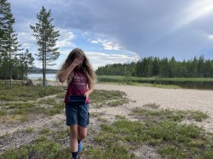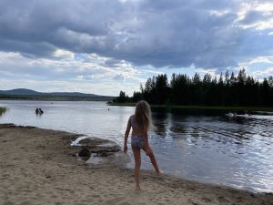 Svegs Lagun ist ein herrlicher weißer Sandstrand an einem Stausee, flach, bestimmt 24 Grad warm und umsäumt von Kiefern und Blaubeeren. Als wir kamen, brachten wir wie gesagt den Regen mit und gingen dann halt im Regen baden. Das war lustig und gleichzeitig praktisch, denn zum einen war es nicht kalt und zum anderen konnten einen durch den Regen die Kriebelmücken und Stechfliegen nicht bekommen.