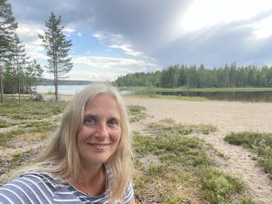 Wir fahren etwa eine Stunde nach Norden, bis wir an den Rastplatz „Sandsjön“ direkt am Sandsjön. Hier machen wir eine Fika, eine schwedische Mittagspause, mit Kaffee aus Christians neuer Nespressomaschine, mit Tee für mich sowie Gebäck und Teilchen vom Konditor. Und das alles an einem Tisch keinen Meter vom See entfernt, direkt neben Wollgras, Lappland-Weide und Sumpf-Scharfgarbe.