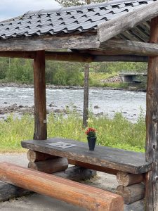 Unseren ersten Stopp machen wir hinter Arvidsjaur und Moskosel am Rastplatz Ljusselforsen am Pitälven. Hier gibt es schöne überdachte Sitzgelegenheiten und ein Klöchen an einem schönen steinreichen Fluss. Wir frühstücken hier am Fluss und Merle spielt und hüpft auf den Steinen herum, bis sie mit ihren „Wandercrocs“ abrutscht und halb ins Wasser fällt. Es ist schön warm, ab und zu tröpfelt es, aber das macht nichts, denn wir haben ja ein Dächlein über unserem Tisch.