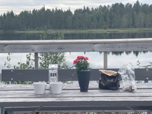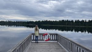 Hier in – wie wir es nennen Gallifrey – machen wir unsere zweite Pause, eine Fika oder auf Deutsch: Vesper, direkt am See Nuolajärvi. Hier hat der lokale Angelverein eine schöne öffentliche Holzterrasse mit Sitzgelegenheiten und ein Klöchen errichtet. Hier essen wir zu viert (sic!) das an der Tankstelle zuvor gekaufte Softeis mit Laktritzstreusel, trinken Tee und essen einen Teil des Kuchens von gestern. Floki darf anschließend ein wenig spielen und dann geht es weiter zur dritten und hoffentlich letzten Etappe.
