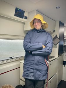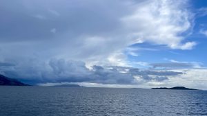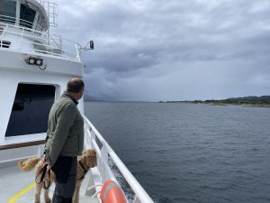 Dann fahren wir endlich mit der Torghatten auf die andere Seite hinüber. Gibt es hier etwa Sonne? Oh, es ist eine Falle! Direkt nach der Sonne kam der nächste Regenguss. Wir fahren bis nach Brönnöysund, wo Christian und Merle einkaufen gehen und ich Floki bürste. Das dauert, denn er ist schon mehrfach nass geworden, ohne dass wir uns anschließend um seine Fellpflege gekümmert hatten. Gut, dass hier grad die Sonne schien.