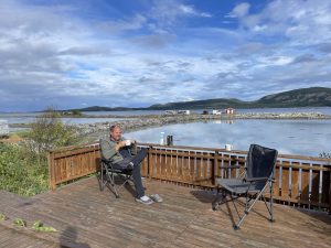 Heute gibt es für den ganzen Tag eine 95%-ige Regenwahrscheinlichkeit. Also hole ich die Stühle raus und wir genießen eine Sonnenstunde auf unserer oberen Terrasse und trinken Tee. Anschließend essen wir im Bus unser Frühstück und kaufen anschließend unser Bacalao bei den netten Campingplatzbesitzern im strömenden Regen ein.