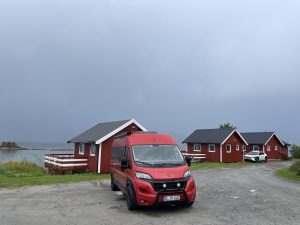 Im Laufe der Straße wird die Landschaft lieblicher – also theoretisch – und wir sehen nasse Felder mit Weizen und Kartoffeln. Wir lassen alle Rastplätze liegen, ich war ja schon einmal mit dem Hundi im Regen und das reicht! Wir fahren die FV17 durch Overhalla bis kurz hinter Namsos. Auf der Insel Ottersöy gibt es einen kleinen Parkplatz namens Varpneset. Er liegt direkt am Meer und wir ergattern noch einen Platz in der ersten Reihe.