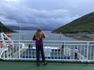 Zuerst fahren wir zum kleinen Ort Tjötta. Von dort fahren wir mit der Fähre namens Stokkafjord nach Forvik. Es ist wieder trocken und wir genießen die Fährfahrt mit dem Blick auf unseren Zielort im Regen. So kam es dann auch in Vevelstad regnet es sehr start und wir fahren erneut an dem schönen Spielplatz und den Helleristningern vorbei, ohne anzuhalten. Wir waren hier soweit wir uns erinnern können noch nie ohne Regen unterwegs.