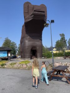 Christian geht einkaufen und ich nehme Merle, Floki und Lisa mit und wir wollen uns den Holzbären ansehen. Er wurde 2002-2005 errichtet und 2019-2023 saniert. Er ist 13 Meter hoch und wiegt selbsttragend 86 Tonnen. Leider kann man nicht in den Bären hinauf klettern, so dass wir ein wenig enttäuscht sind.