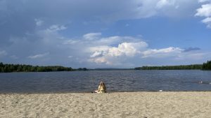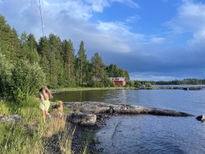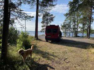 Hier können wir direkt „im“ bzw. besser „am“ Sandstrand parken. Niemand außer ein paar einheimischen Schweden ist hier bei uns. Ich springe sofort ins Wasser. Ebenfalls 27 Grad warm bei strahlendem Sonnenschein und ebenfalls 27 Grad Lufttemperatur. Auch Floki kommt mit ins Nass und freut sich des Lebens.
