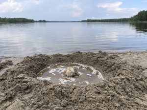 Anschließend baue ich mit Merle eine Sandburg und – auf besonderen Wunsch hin – noch einen Meteoritenkrater mit Kratersee. Eine Schwedin kommt auf mich zu und erzählt mir, dass es hier letzte Nacht rappelvoll mit Wohnmobilen war. Da haben wir ja Glück, dass wir jetzt so einmal hier stehen dürfen.