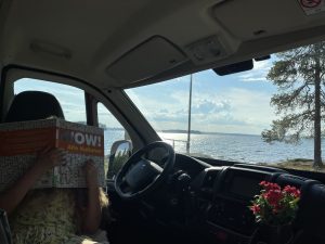 Ein Gewitter zieht rasch auf und wir gehen in den Bus zurück, um eine Fika, eine schwedische Mittagspause zu machen. Es gibt Tee und Schokoboller, eine Mischung aus Butter, Zucker, Öl und Nougat sowie Schokolade drumherum. Nach der Pause ging Christian mit Floki in den Wald – kam aber binnen kürzester Zeit wieder zurück, etliche Mückenstiche eingefangen habend. Regenwetter scheint sie aus ihren Verstecken zu locken, denn bisher ja, waren sie da, aber nicht wirklich störend.
